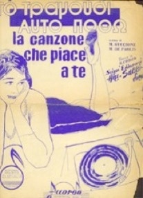 Gli spartiti de «La canzone che piace a te» in italiano e nella versione greca. L’illustrazione è di un giovanissimo Guido Crepax, come si legge nella firma in basso a destra, accanto al giradischi, nell’edizione italiana