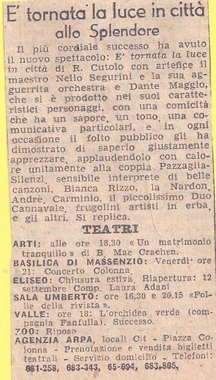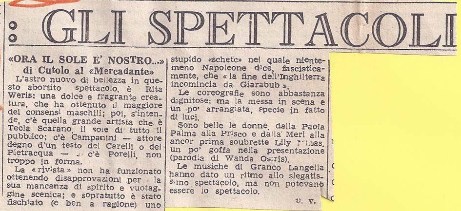 Pubblichiamo in questa pagina i ritagli stampa trovati tra le carte di Raffaele Cutolo. Si tratta, pertanto, di una raccolta né organica, nè completa, ma tuttavia essa costituisce una testimonianza valida sia del costume del tempo, sia del valore delle opere di Cutolo. Per questo motivo l’elenco comprende anche le poche recensioni negative, dovute prevalentemente - come si riconoscerà in alcuni casi dalle testate su cui erano state pubblicate - a presupposti di natura ideologica, poco inclini - anche in quella giovane democrazia della fine anni Quaranta - ad accettare la satira politica.